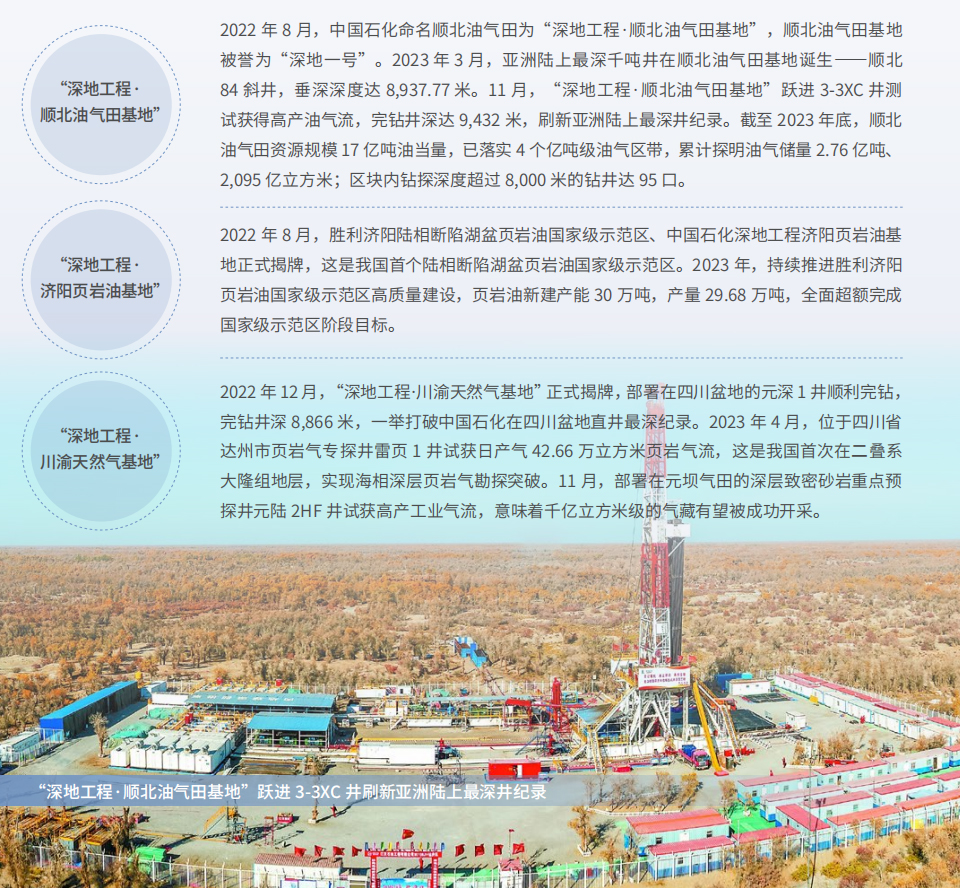 中國石化在深地油氣領域勘探開發(fā)上持續(xù)發(fā)力,攻克超深、超高溫、超高壓等世界級難題,“深地工程”已經(jīng)從新疆大漠拓展到渤海之濱與川渝地區(qū)。目前,中國石化擁有“深地工程·順北油氣田基地”“深地工程·濟陽頁巖油基地”和“深地工程·川渝天然氣基地”,深層、超深層油氣勘探開發(fā)取得重要進展,為保障國家能源安全、端牢能源飯碗提供了有力支撐。