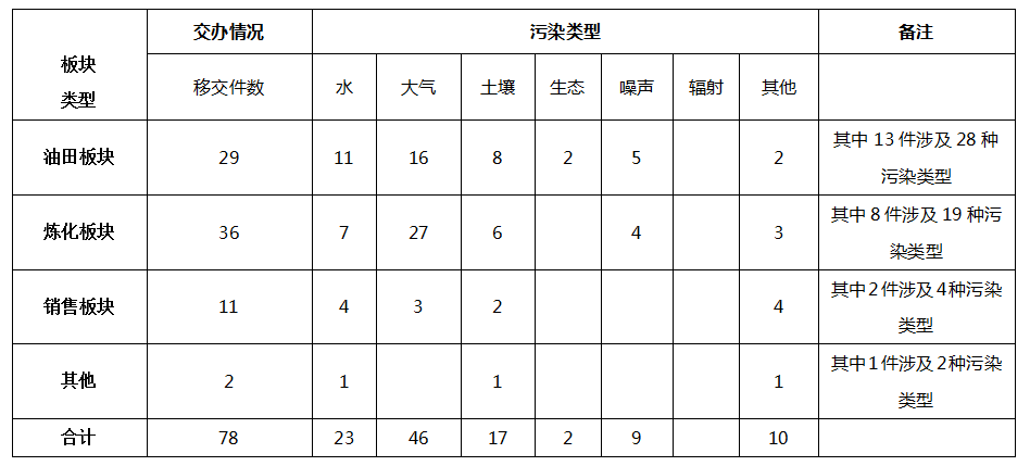 截至當日,中國石油化工集團有限公司已累計收到中央第六生態環境保護督察組交辦的信訪舉報件78件(包括21件重復舉報件),其中,涉及水污染23件、大氣污染46件、土壤污染17件、生態2件、噪聲9件、其他污染10件。所有舉報件均已及時轉交企業辦理。