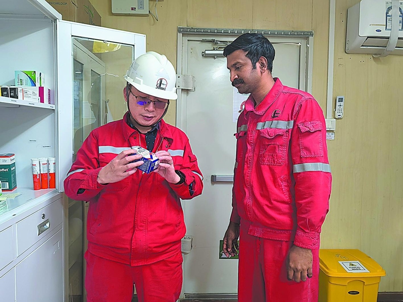 為了讓來自不同國家的外籍員工更好地融入團隊,項目部堅持以尊重為本,關愛員工身心健康。所有隊伍都配有外籍專職醫生,并配備常用藥品和急救設備,為員工提供24小時的日常健康咨詢、緊急醫療處置和職業健康檢測服務。他們每周還在營地組織“健康巡診日”,由專職醫生為員工測量血壓、血糖,評估體檢數據并提出飲食與作息建議。印度籍醫生納吉布曾在巡診中發現一名鉆工有中暑征兆,他第一時間采取降溫與補液措施,緩解了這名員工的不適。此外,項目部還定期開展“健康小課堂”,培訓常見急救知識、高溫應對方法,幫助員工增強健康意識、筑牢健康防線。