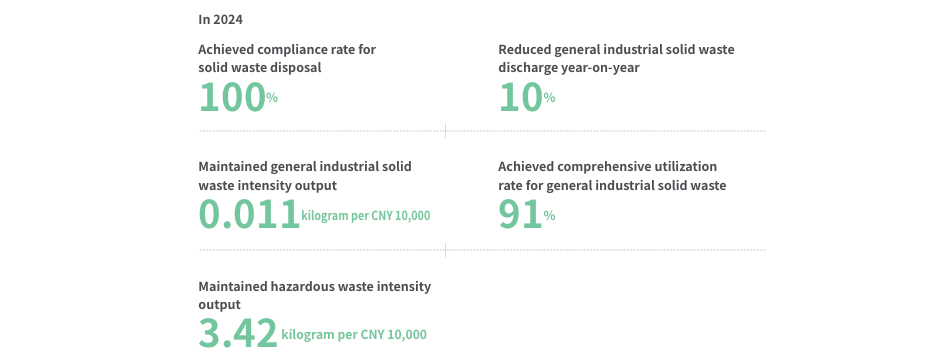 Sinopec has issued a series of policy documents, including the Sinopec Pilot Work Plan for Developing a "Waste-Free Group", the Sinopec Evaluation Index System for Pilot Development of a "Waste-Free Group", and the Sinopec Action Plan for Resource Conservation and Efficiency, to clarify objectives and assign responsibilities for the standardized, reduced, recycled, environmentally safe disposal, and digitalized management of hazardous solid waste during the 14th Five-Year Plan period. The Company has also implemented several key initiatives, such as greening its processes, adopting clean raw and auxiliary materials, reducing sludge through drying technologies, and promoting waste recycling. In addition, it has strengthened green procurement and packaging practices to cut down on industrial solid waste and encourage resource reuse. By the end of 2024, Sinopec had established 10 regional centers for hazardous waste disposal and recycling, built 52 "waste-free enterprises", and implemented 181 targeted initiatives, generating cost savings and efficiency improvements totaling CNY 550 million. In 2024, the Company achieved 100% compliant disposal across all categories of solid waste, with zero incidents of illegal or non-compliant handling, and the intensity of hazardous waste generation was 10.7 kilograms per CNY 10,000 of industrial output. Notably, Sinopec Jiujiang Company was recognized by the Ministry of Industry and Information Technology as a representative "waste-free enterprise".